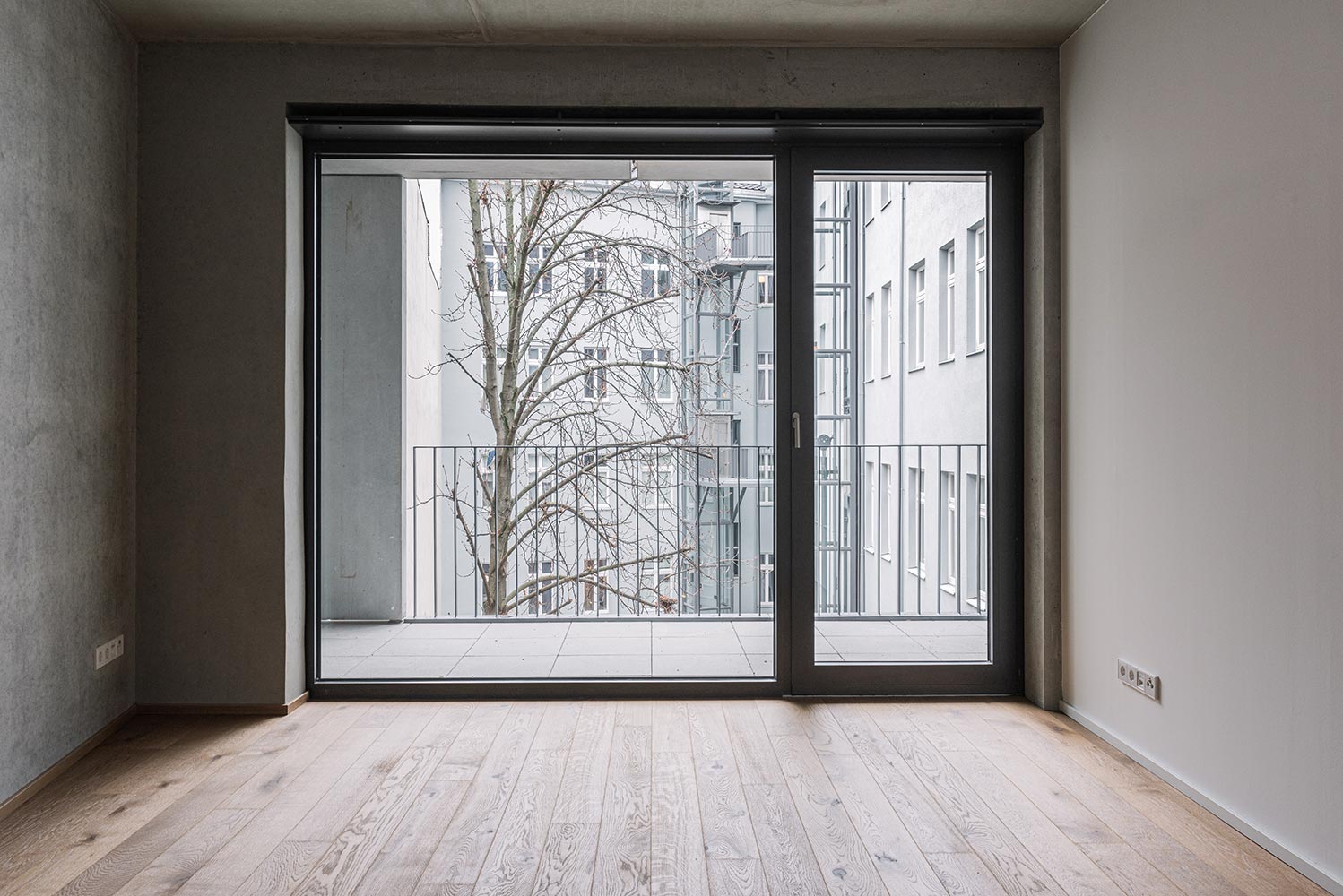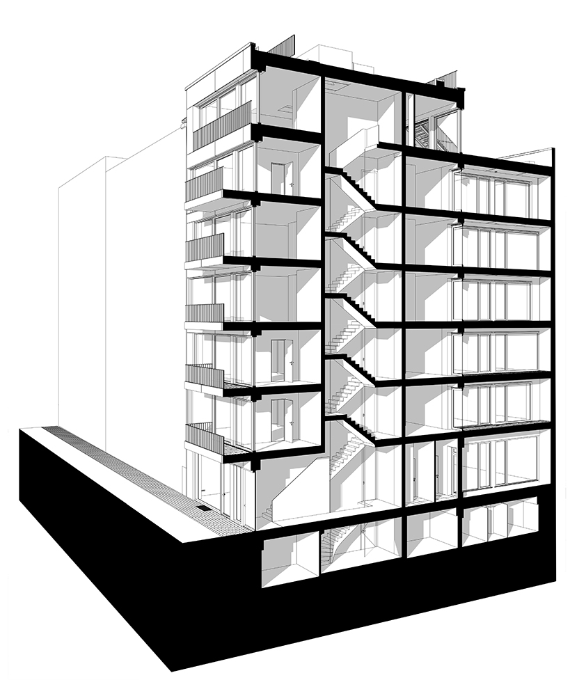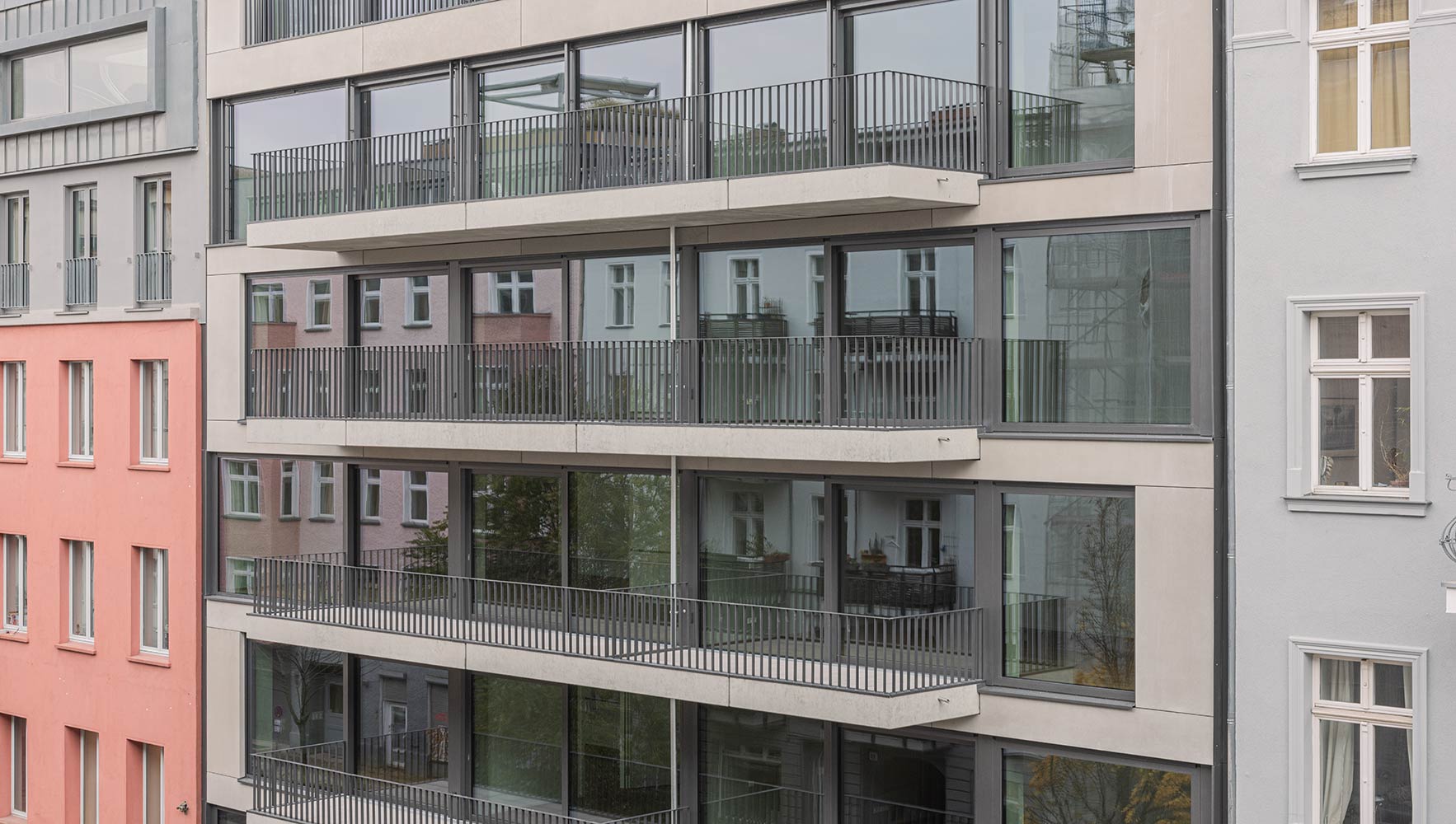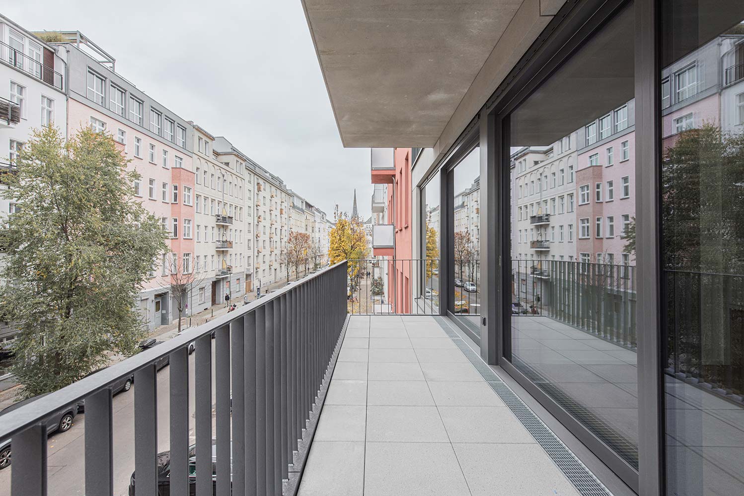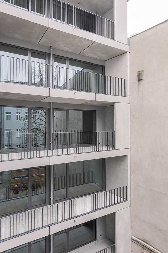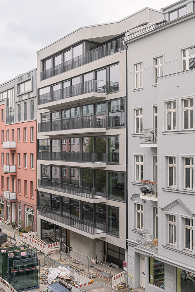 Das Gebäude schließt eine klassische Berliner Baulücke und vermittelt dabei in mehrfacher Hinsicht mit dem heterogenen Bestand. Die östliche Grenzbebauung ist vom klassischen 18m-Raster des Berliner Mietshaus mit flachem Dach geprägt, die westliche von einer mehr als 40m breiten Fassade und schrägem Dach. Der Neubau nimmt die Giebelhöhe des westlichen Nachbarn auf und vermittelt über die Tektonik, also die Verschiebung von Fassadenfronten und Balkonen, mit der straßenprägenden Traufkante des östlichen Nachbarn. Die charakterbildenden Balkone nehmen das horizontale Format des westlichen Nachbargebäudes auf. Durch das vertikale Format der Baulücke kommt es in der Fassade zur Überlagerung und Schichtung von horizontalen und vertikalen Formen. Das Gebäude bietet rund 1.500 Quadratmeter Wohnfläche auf sieben Etagen. Im Erdgeschoss befindet sich eine Gewerbeeinheit, darunter die Tiefgarage für zehn Fahrzeuge. Der innenliegende Treppenhauskern erschließt zwei Wohnungen pro Etage. Die Bäder der Wohnungen sind um den Kern konzentriert. So wird Raum für eine raumhoch verglaste Fassade geschaffen, durch die der Innenraum visuell bis auf die Straße erweitert wird. Die Brandwände werden in Sichtbeton ausgeführt und sind über ihre gesamten Länge erlebbar. Sie bilden das Rückgrat jeder Wohnung.