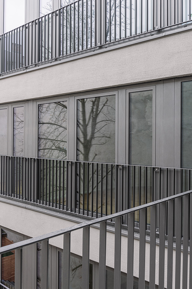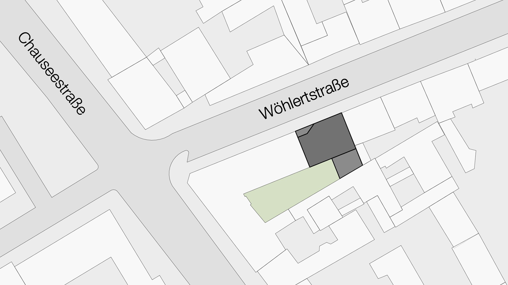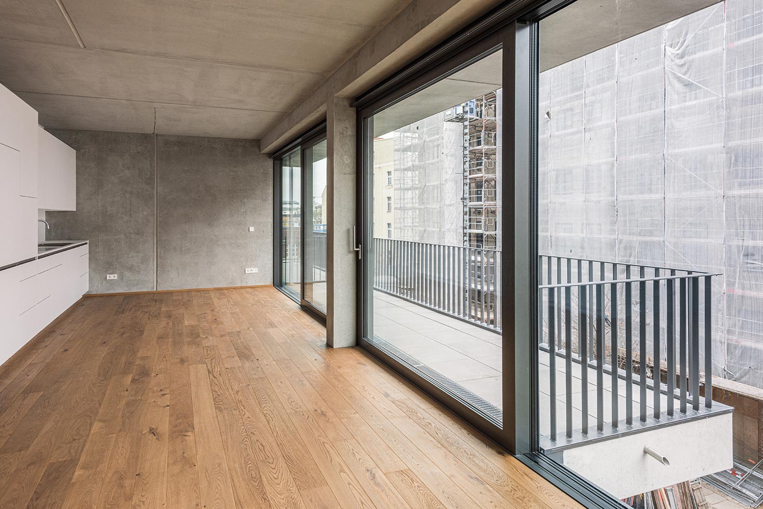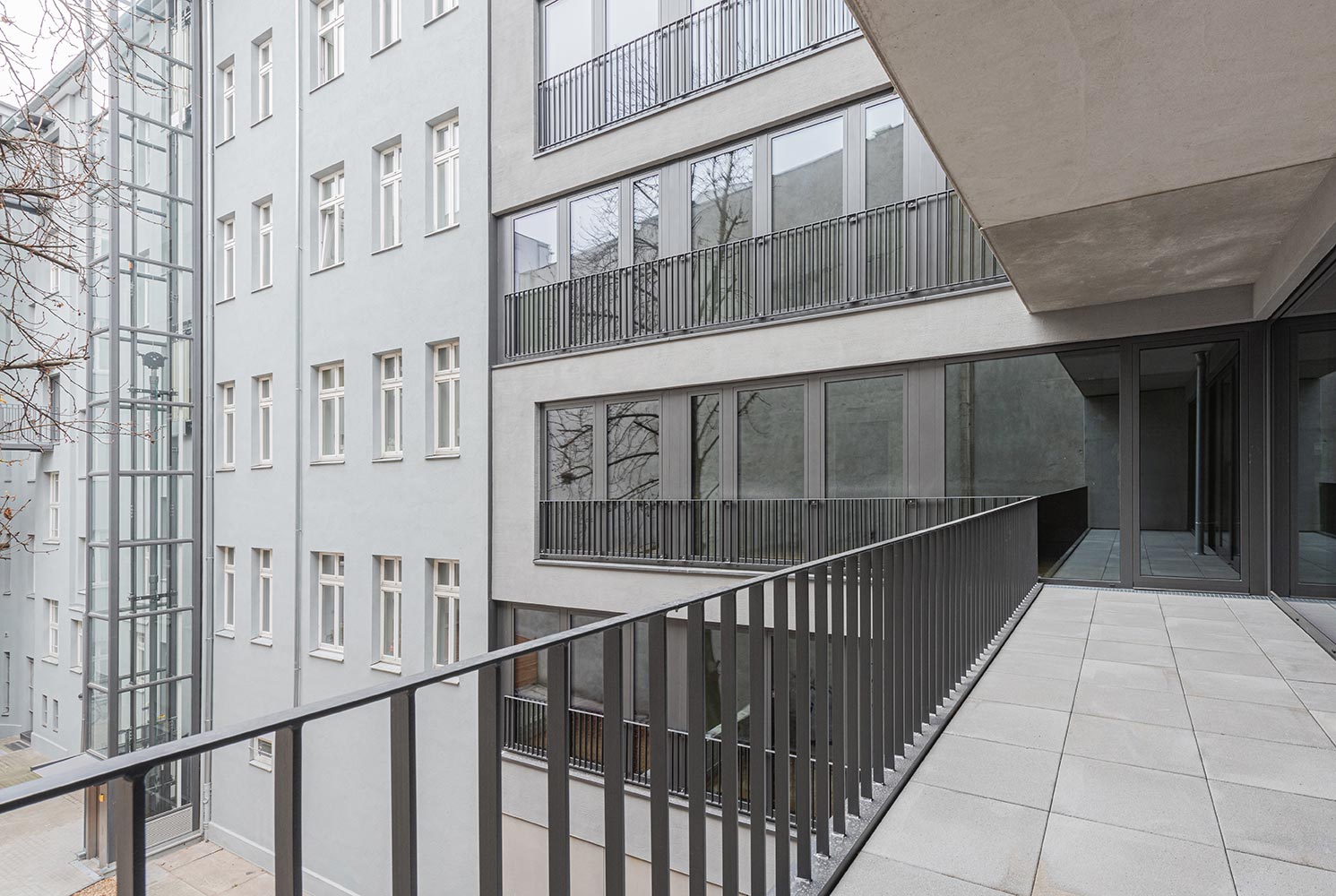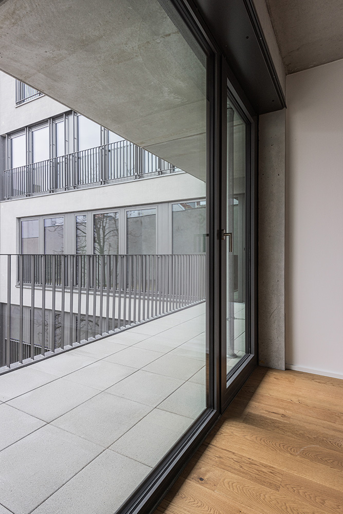 Das Gebäude schließt eine klassische Berliner Baulücke und vermittelt dabei in mehrfacher Hinsicht mit dem heterogenen Bestand. Die östliche Grenzbebauung ist vom klassischen 18m-Raster des Berliner Mietshaus mit flachem Dach geprägt, die westliche von einer mehr als 40m breiten Fassade und schrägem Dach. Der Neubau nimmt die Giebelhöhe des westlichen Nachbarn auf und vermittelt über die Tektonik, also die Verschiebung von Fassadenfronten und Balkonen, mit der straßenprägenden Traufkante des östlichen Nachbarn. Die charakterbildenden Balkone nehmen das horizontale Format des westlichen Nachbargebäudes auf. Durch das vertikale Format der Baulücke kommt es in der Fassade zur Überlagerung und Schichtung von horizontalen und vertikalen Formen. Das Gebäude bietet rund 1.500 Quadratmeter Wohnfläche auf sieben Etagen. Im Erdgeschoss befindet sich eine Gewerbeeinheit, darunter die Tiefgarage für zehn Fahrzeuge. Der innenliegende Treppenhauskern erschließt zwei Wohnungen pro Etage. Die Bäder der Wohnungen sind um den Kern konzentriert. So wird Raum für eine raumhoch verglaste Fassade geschaffen, durch die der Innenraum visuell bis auf die Straße erweitert wird. Die Brandwände werden in Sichtbeton ausgeführt und sind über ihre gesamten Länge erlebbar. Sie bilden das Rückgrat jeder Wohnung.